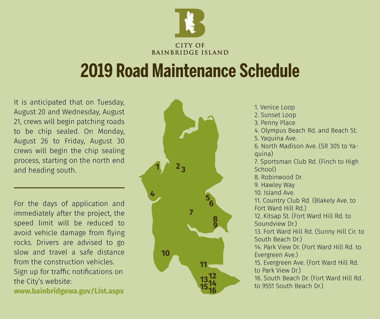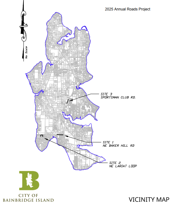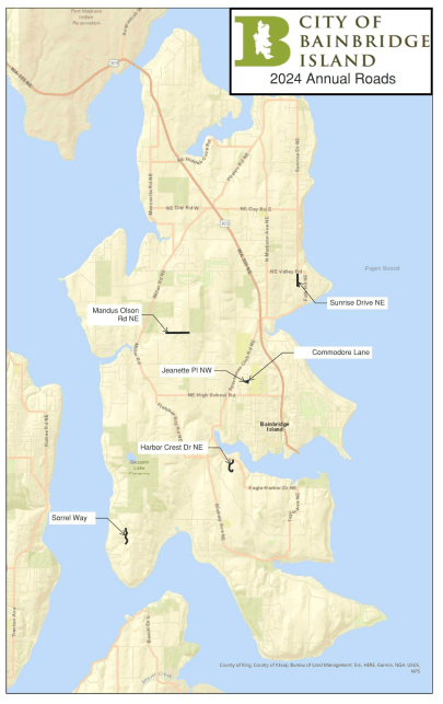 The City of Bainbridge Island maintains a 140-mile road network. Each year, the City receives an average of $1,000,000 for roads and repair projects. The budget includes $400,000 from the Transportation Benefit Fund (TBF or car-tab fees) revenues, and the remainder is supported by the City’s Street Fund.