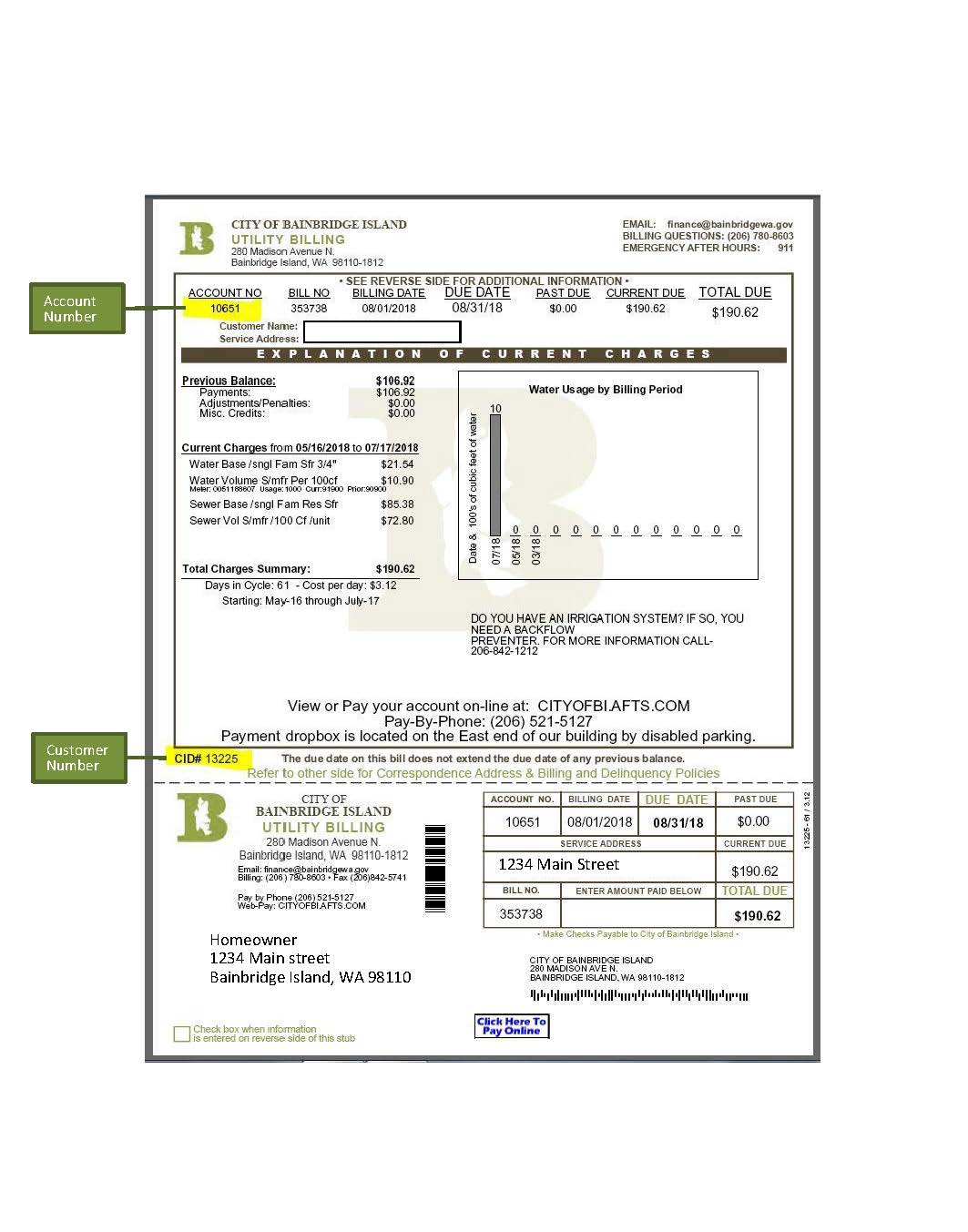 • In order to make a payment you will need your Account Number and your Customer ID Number, both located on your bill.   Please note, at this time you are unable to search and view past bills. We apologize for any inconvenience.